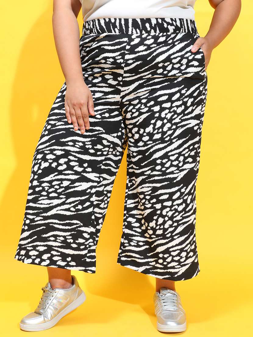 Step into contemporary style with ourSuper Trendy Black Animal Printed Elasticated Women Plus Size Culottes, crafted from lightweight polyester for a blend of comfort and trend-setting fashion. These culottes feature a chic animal print design against a classic black background, adding a touch of boldness to your wardrobe. The elasticated waistband ensures a comfortable and flexible fit, making them ideal for all-day wear. Equipped with practical side pockets, these culottes combine functionality with modern aesthetics. They offer ample storage while maintaining a sleek silhouette that flatters every figure and offering a relaxed yet stylish look suitable for various occasions. Pair these culottes with your favorite blouse or top for effortless style. Whether you're dressing up for a night out or opting for a casual day look, these culottes promise versatility and comfort without compromising on fashion.