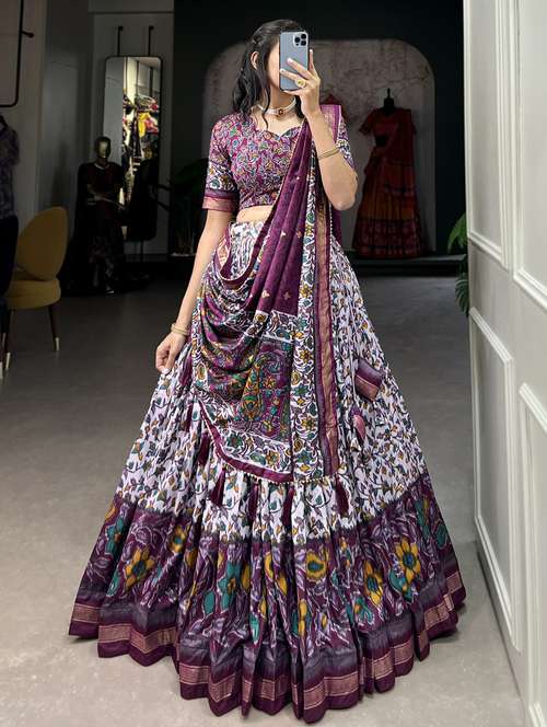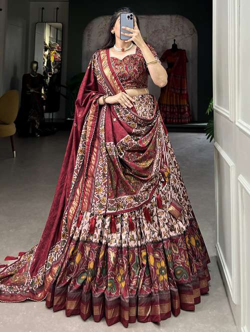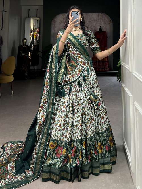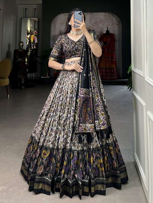 Color : Black, Introducing our Women's Tusser Silk Fabric Printed with Foil Work Lehenga Choli, Dupatta Lenght is 2.4 Meter. Lehenga Flair : 3 Mt, Lehenga Length is 41 Inch. Lehenga is Stitched which can be fitted up to 44 inch Waist Size. Choli 0.80 (Blouse) is unstitched and can be altered according to your fit and style that you require. It has unstitched Choli with Printed Work. Dry Clean Or Normal Hand Wash. Product color may slightly vary due to photographic lighting sources or your monitor settings.