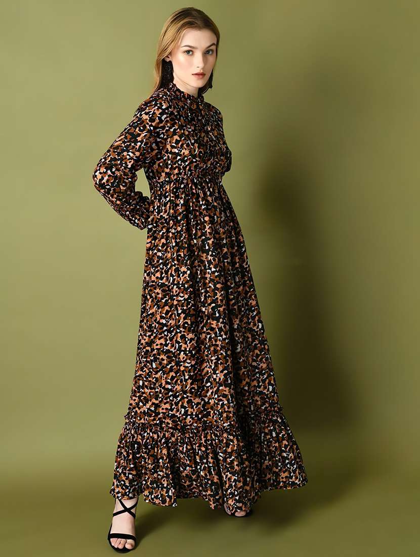 women animal printed long sleeve tiered maxi dress