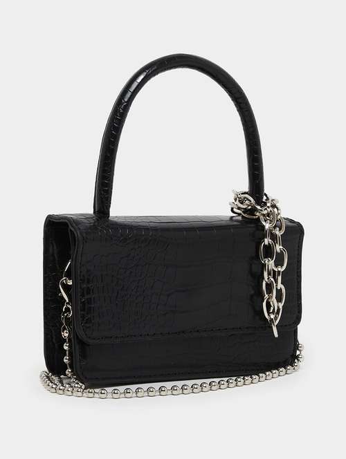 Elevate your accessory game with the Croc Textured Handbag in black. Featuring a bold croc-textured design with chain detailing, this bag adds an edge to your outfit. The regular size (18 x 2 x 11 cm) offers enough space for your essentials, while the detachable sling strap ensures easy carrying for any occasion.