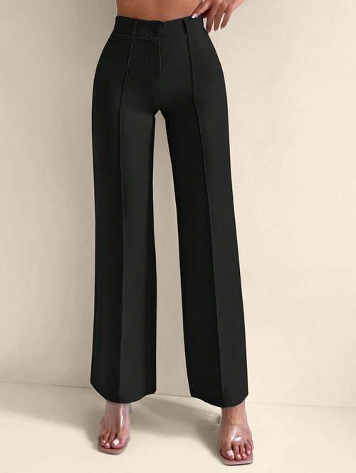 Stylish and comfortable, women's pants & trousers in soft and solid colors that look perfect for regular wear, with beautiful designs and patterns. This high-waist formal trouser or pants for women can be worn at offices and functions. Featuring button, zipper, belt loop, elasticated, carrera fabric. Available in Purple, Maroon, Blue, Navy and Black Color.