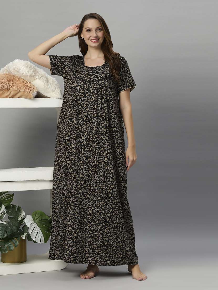 Elevate your loungewear collection with Quira's Women's Floral Gown in a classic shade of black. Made from high-quality Poly Cotton, this gown offers a soft and breathable feel perfect for all-day comfort. The delicate flower print and stylish half sleeves add an elegant touch, making it suitable for casual lounging or as comfortable nightwear. The regular fit and round neck design provide a flattering silhouette, while the long length offers extra coverage and warmth for those relaxing moments at home. Whether you're unwinding after a long day or simply enjoying your downtime, this Floral Gown from Quira ensures you do so in style and comfort.