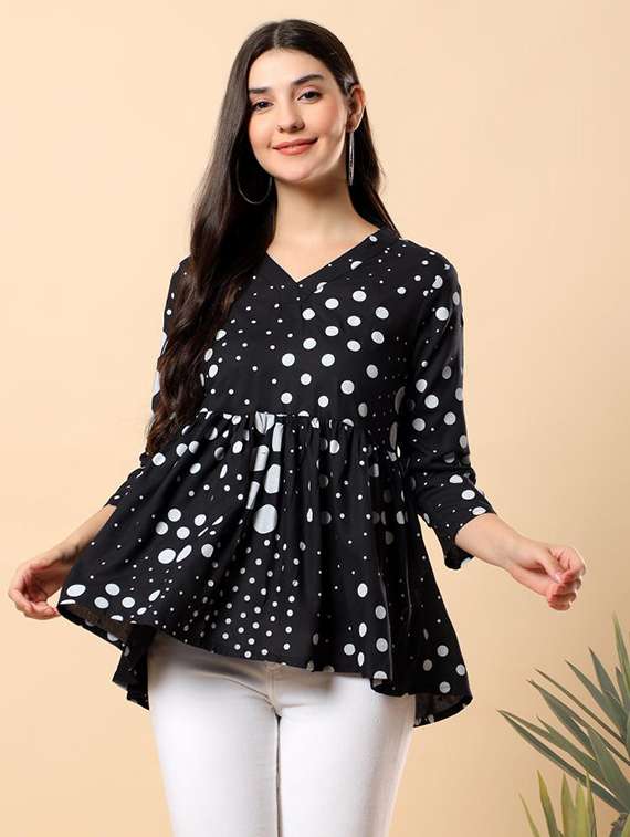 women polka dot printed three quarter sleeve flared top