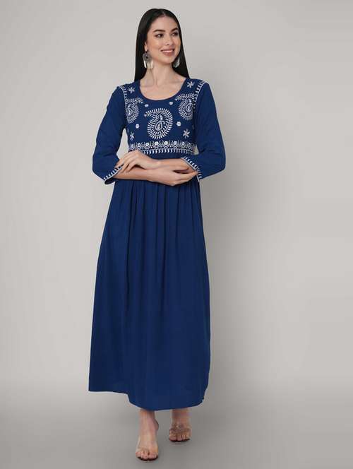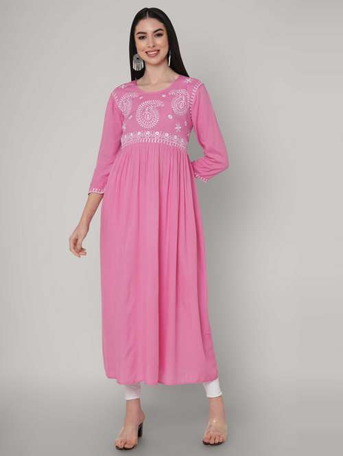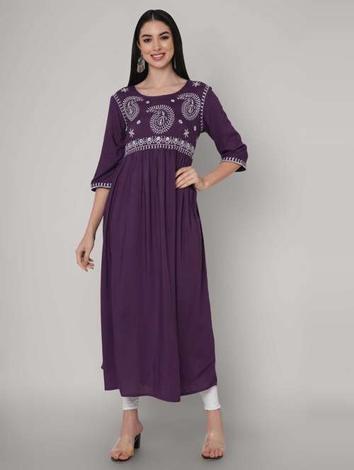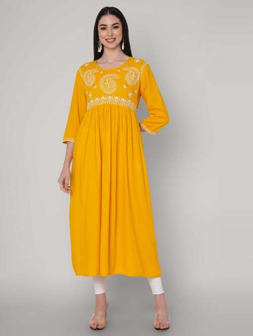 - Grab this beautiful kurta made up of rayon fabric featuring round neck designs.