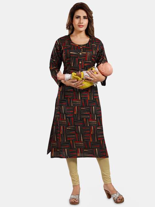 Make yourself look highly comfortable & stylish with this Fine Rayon Feeding/Maternity Straight Kurti. This printed Straight Kurti has zipper on both side for feeding purpose with 3/4 Sleeve & Round Neck. It is the ultimate blend of comfort.