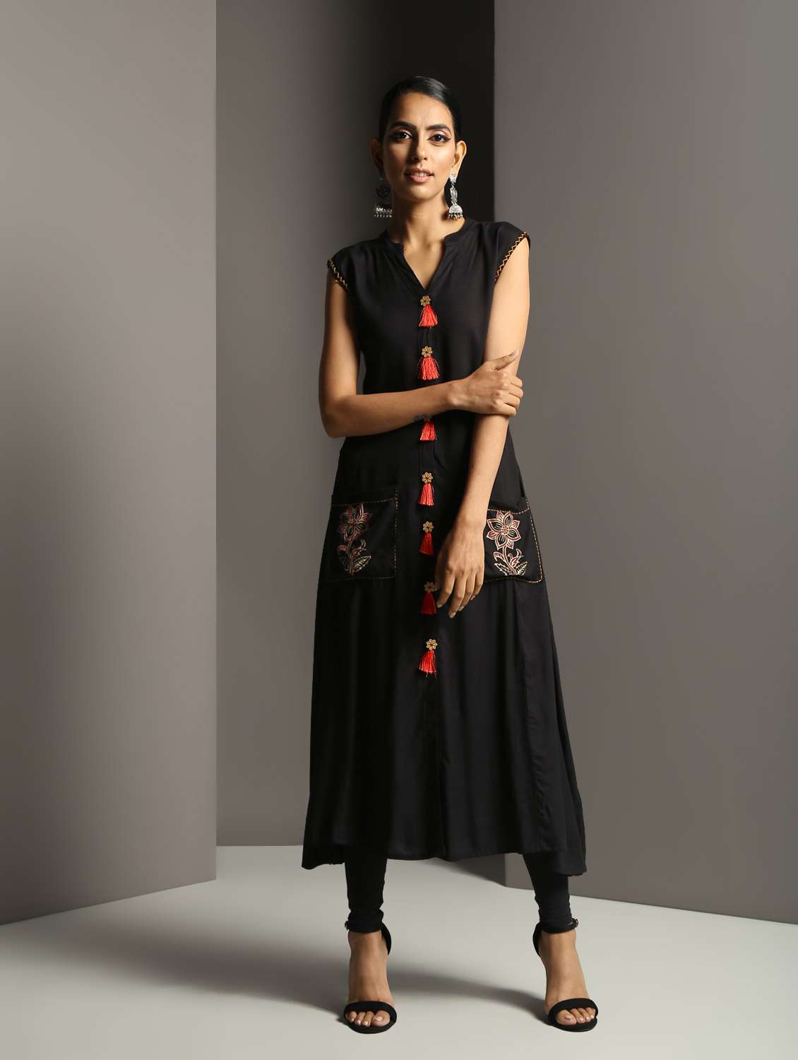 block print a-line kurta with tassels