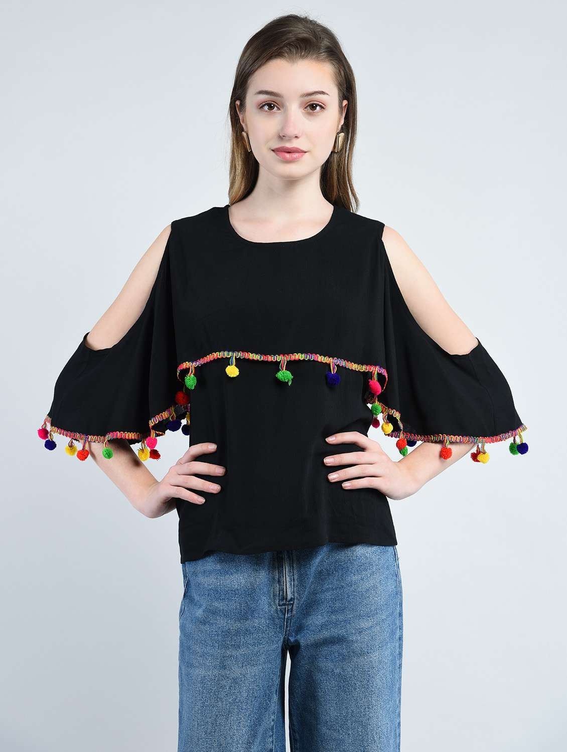 pom pom detail cold shoulder top