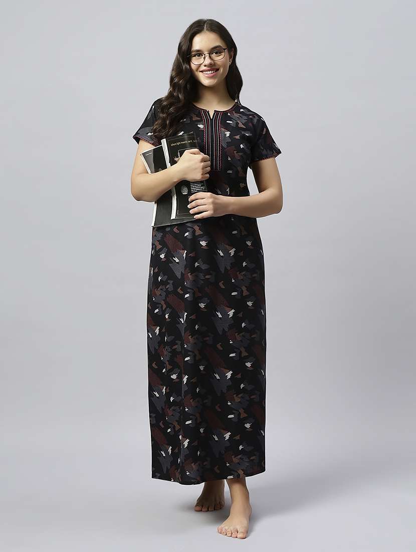 Quira Women's Black Lounge Wear Gown - Regular Fit, Ideal for Women's, Occasion Type: Lounge Wear, Fabric Type: Viscose Rayon, Pattern: Formal, Sleeve Type: Half Sleeves, Color: Black, Collar Type: Round Neck