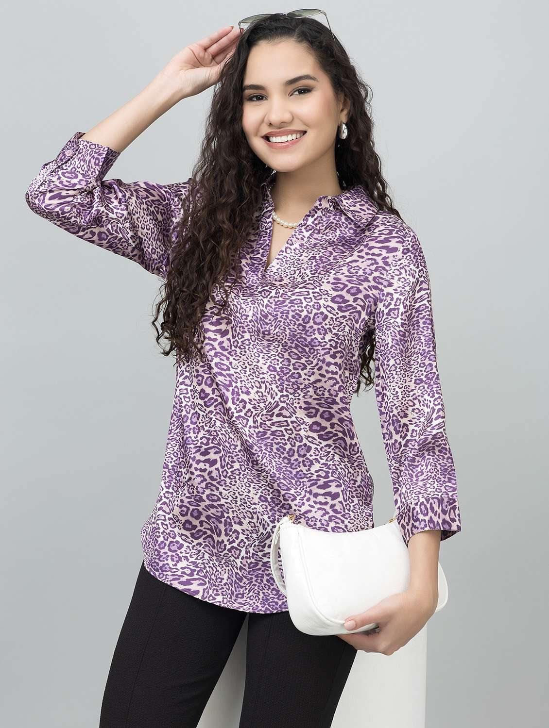 - » women animal printed collared high low top