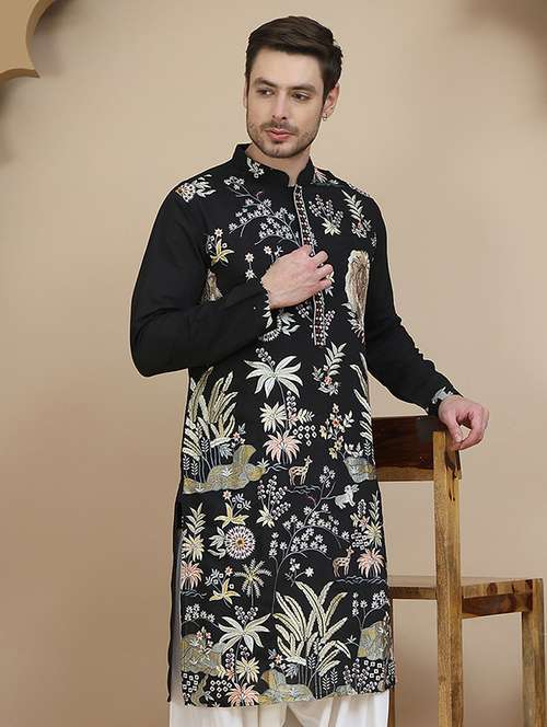 Black Embroidered Silk Blend Kurta , designed for men who appreciate heritage fashion with a touch of modern artistry. This standout ensemble is perfect for festive gatherings, traditional ceremonies, or special occasions.