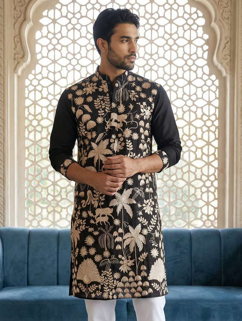 This Black kurta, with a Silk Blend base and floral embroidery, is perfect for a festive occasion, sangeet, or engagement ceremony. It exudes traditional charm and elegance.
