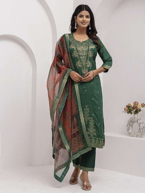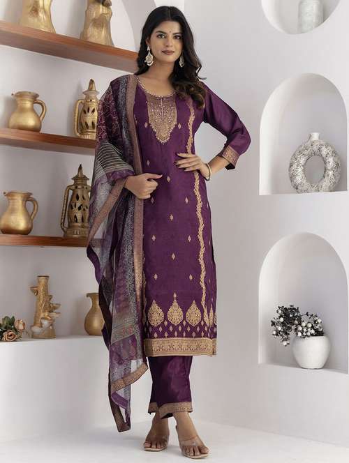 - Browse through the latest range of ethnic sets for women with tailored sleeve designs with zari works.