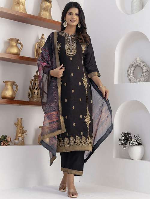 - Find gorgeous sets of ethnic wears in trending designs in black colors suitable for festive wear of occasions.
