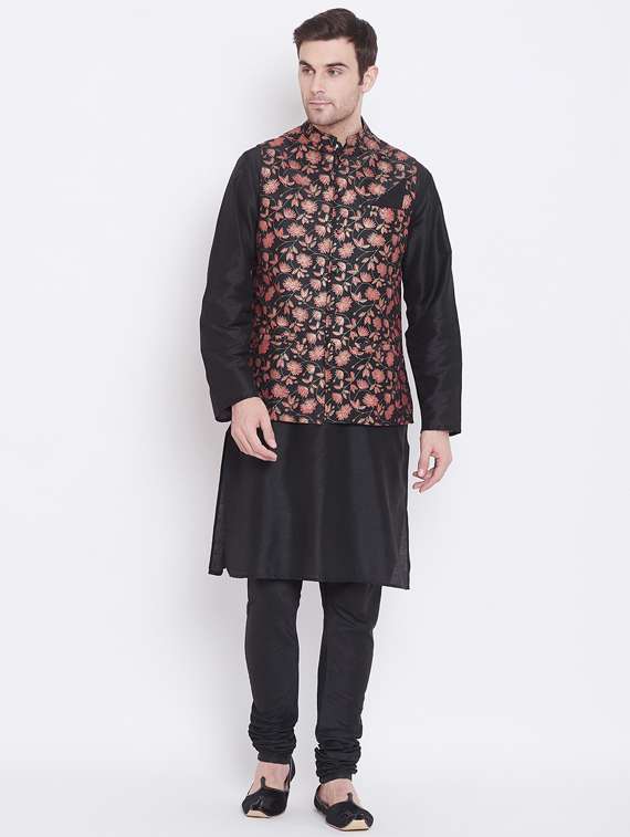- » black solid silk blend kurta pyjama set with printed nehru jacket