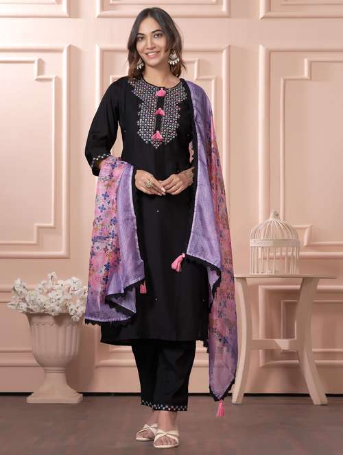 - Find gorgeous sets of ethnic wears in trending designs in black colors suitable for festive wear of occasions.