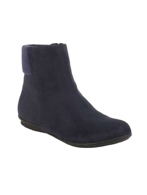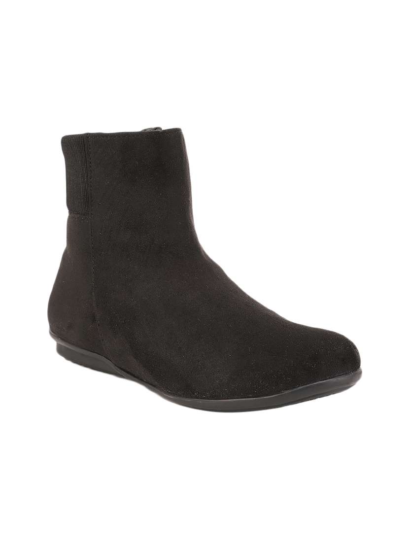 Latest Boots Collection From A Premium Brand Bruno Manetti. A Pair of Women's Comfortable & Fashionable Black Color Zip Closure Mid Ankle Length Suede Round Toe Flat Heel Boots Having PU Insole & TPR Sole Material.