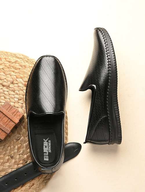 - Explore the epitome of comfy black slip ons with round shapes to provide you an elated experience every time you put them on.