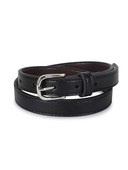 Punnu black formal belt for women is expertly fashioned from premium vegan leather, selected for its unparalleled durability and ethical provenance. The design is further enhanced by a sophisticated chrome finish buckle, offering a timeless accessory.