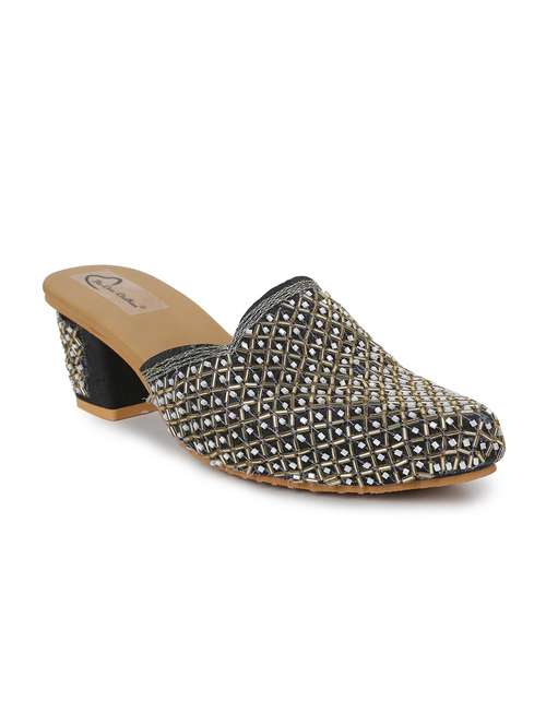 A pair of Black mules ,has regular ankle and open back Synthetic upper with embellished Cushioned footbed Textured and patterend outsole, has a block heels