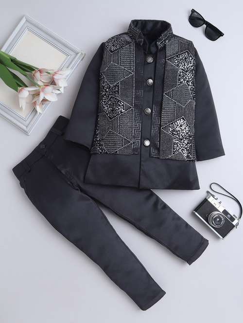 - » boys full sleeves solid indo blazer & trouser set with embroidered waistcoat