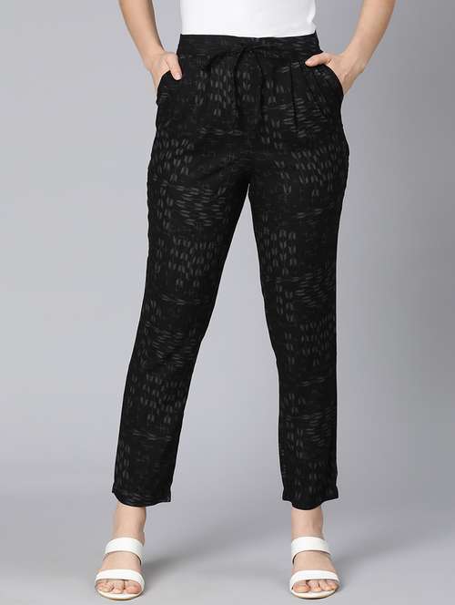 Treasury black floral print elasticated women's pant is the perfect outfit for your office look as it blends in elegance and perfectness that you are looking in a formal outfit. It is a blend in viscose fabric and has an all-over floral print, elasticated waist with adjustable tie-knot thread to raise the waistline, pockets on the side, and straight long length. Pair it with smart looking shirt and top for the outright formal look and keep your shine on always