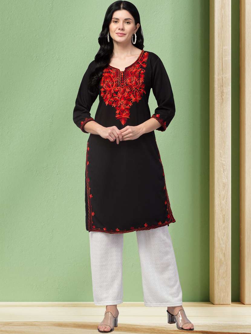 women black solid with work woolen kurta