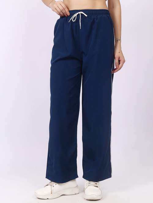 A pair of women’s casual track pants in a many color. The pants feature an elastic waistband with a white drawstring for adjustable comfort and side pockets for convenience. A sporty touch is added with three vertical white stripes running down the length of each leg. The relaxed, straight-fit design pairs well with sneakers, making it suitable for casual wear, workouts, or lounging.