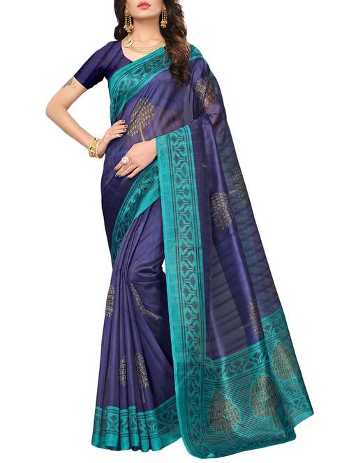 blue art silk printed saree with blouse