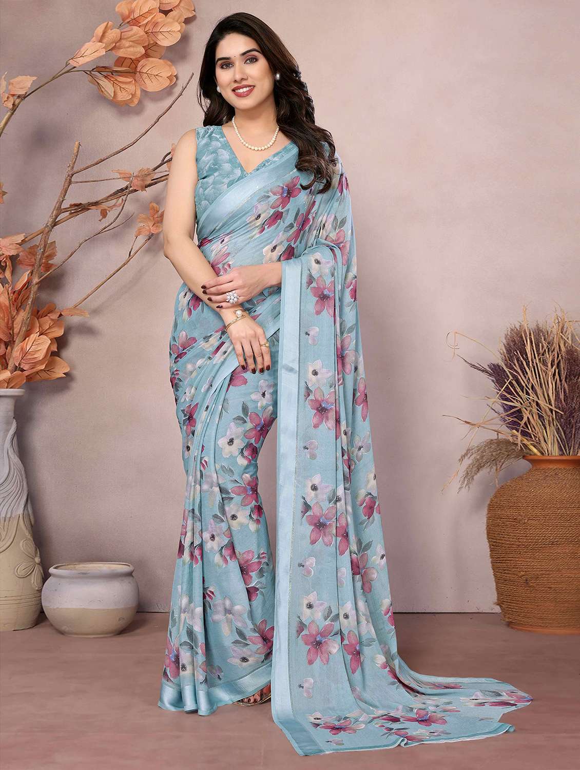 - » women light blue floral printed saree with blouse