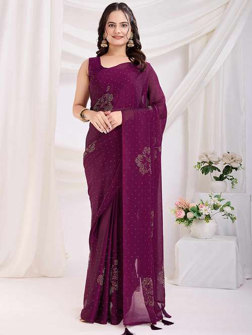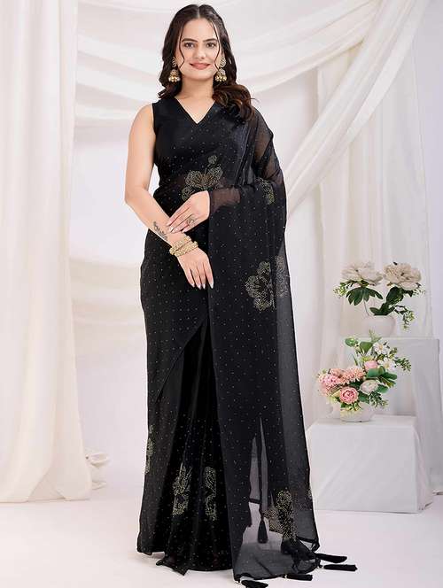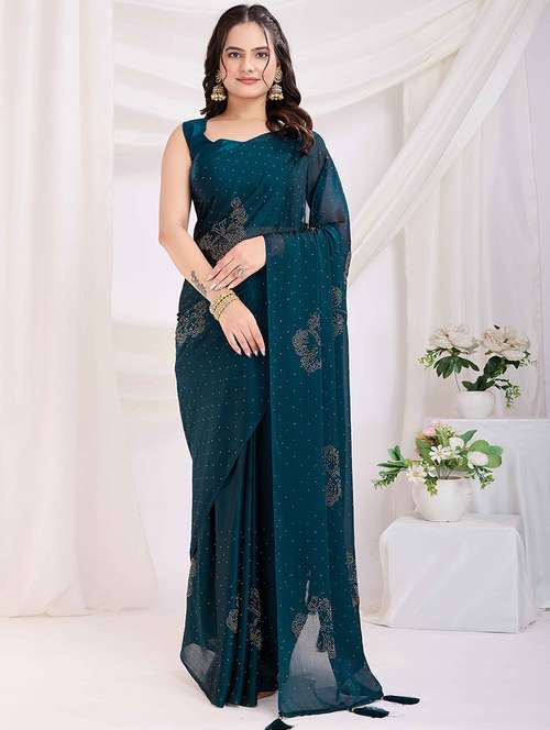 Morpich Blue colored saree is made from rangoli art silk fabric which is highlighted with beautiful floral swarovski work as shown. Comes along with mono banglory blouse piece which you can customise as per your design/style.