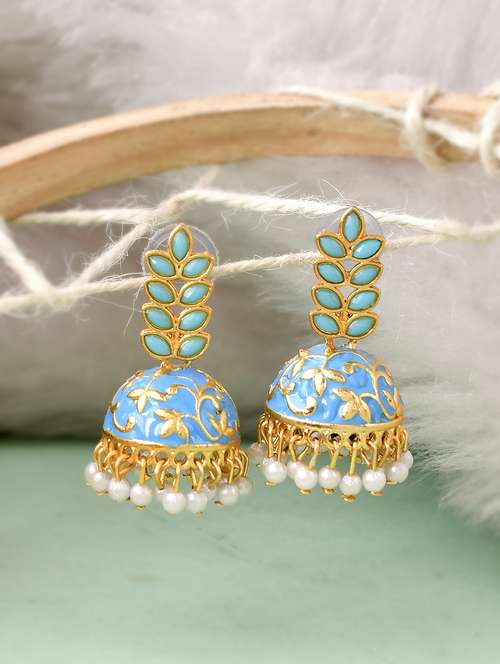 Women Gold Plated Blue Floral Meenakari Designer Jhumkas