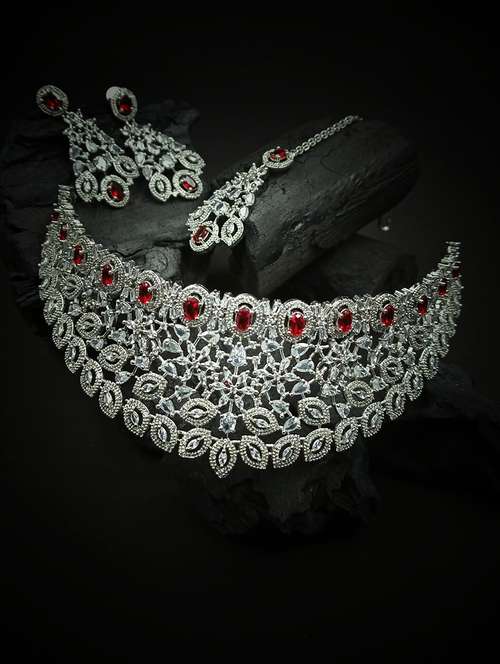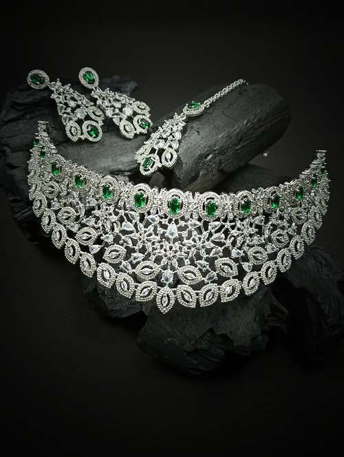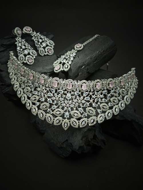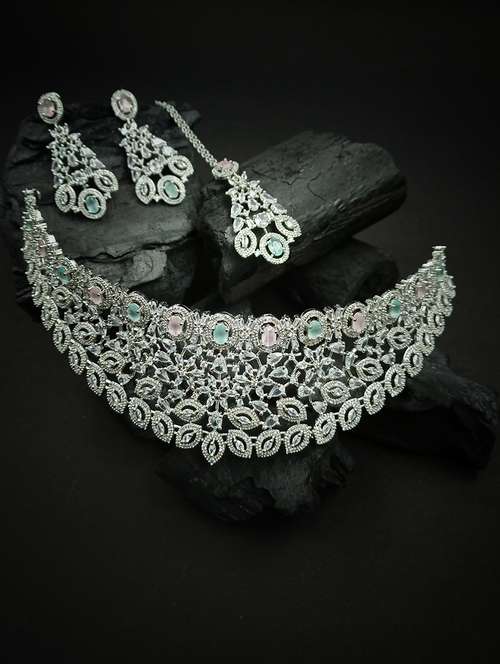 - » silver plated cubic zirconia bridal necklace with earrings and maangtika
