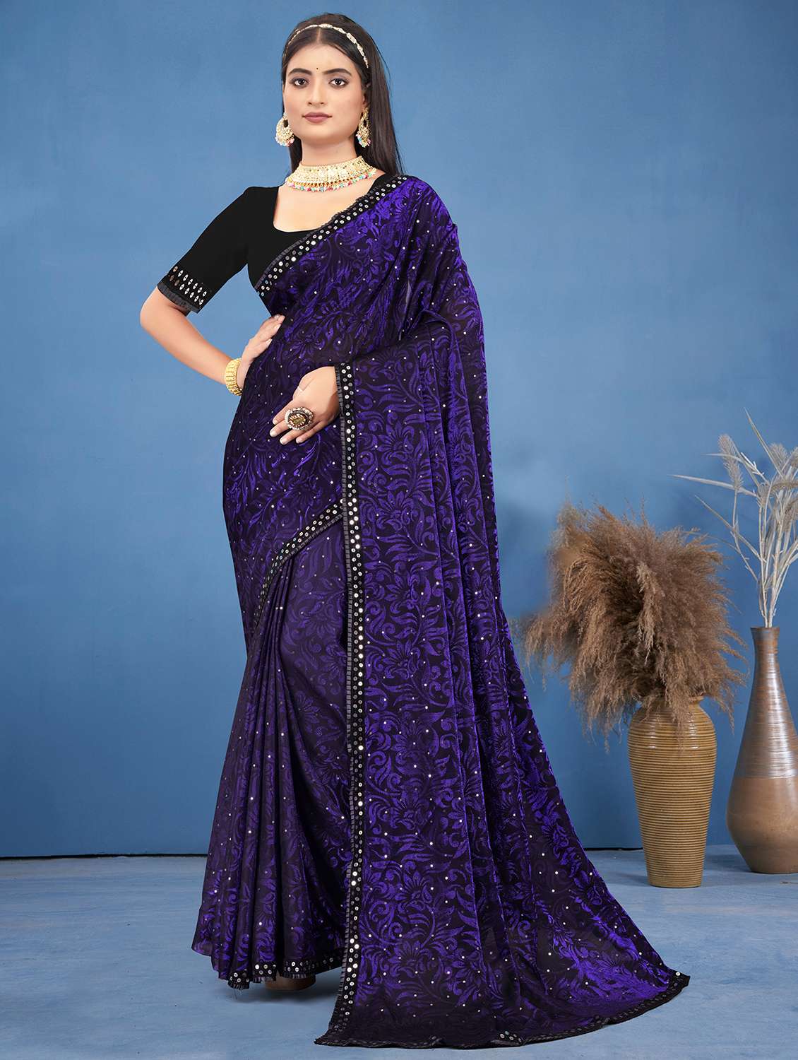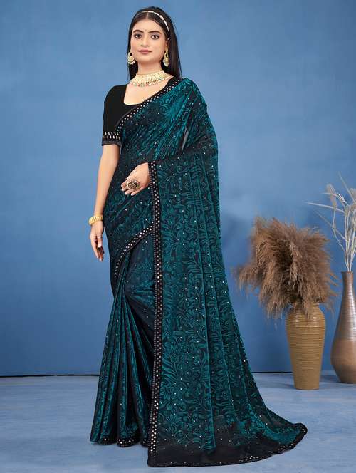 We offer high Quality Range of Lycra Blend Brasso Net Floral Pattern Saree with Sequence Lace Border that is Designs by our Creative Professionals and at the same time perfect mix of modern patterns and contemporary designs of ethnic collection. Look stunningly beautiful in this lovely sari that is decorated with intricately Sequence Embellishment Technique. Black Plain Banglori Silk Blouse with Lace Border is available to add the glam. Sarees give you the opportunity to give a modern touch to a traditional Indian attire. Get a minimal yet gorgeous look with these flowy drapes, elegantly dropping from the waist to make you all time perfect. These sarees will look perfect at religious ceremonies, formal occasions, celebrations, party and traditional get-togethers. You can also pair it with a pair of earrings and bangles when adorning this outfit for a festive occasion. Product Color May Slightly Variation Due To Photographic Lighting Or Your Screen Settings And Other Accessories Are Only Modeling Purpose.