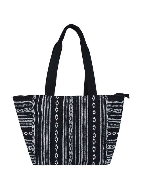 This blue & black canvas shoulder bag has a double handle. It has one main compartment with zip closure. It has 1 inner pocket and 1 mobile pouch.