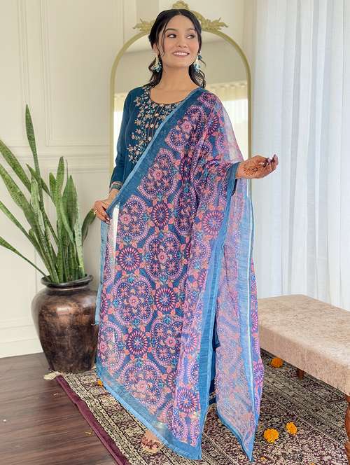 women solid with work long sleeve kurta pant with dupatta set