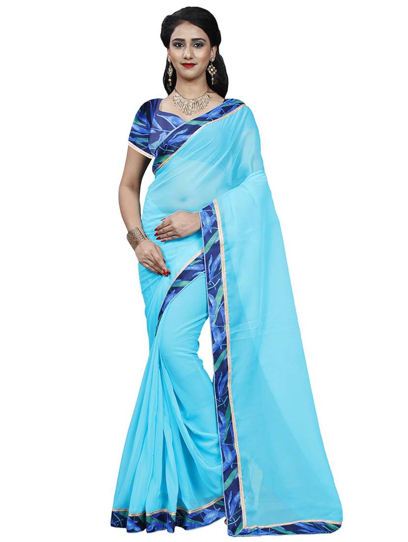 women's bordered royal blue colored saree with blouse