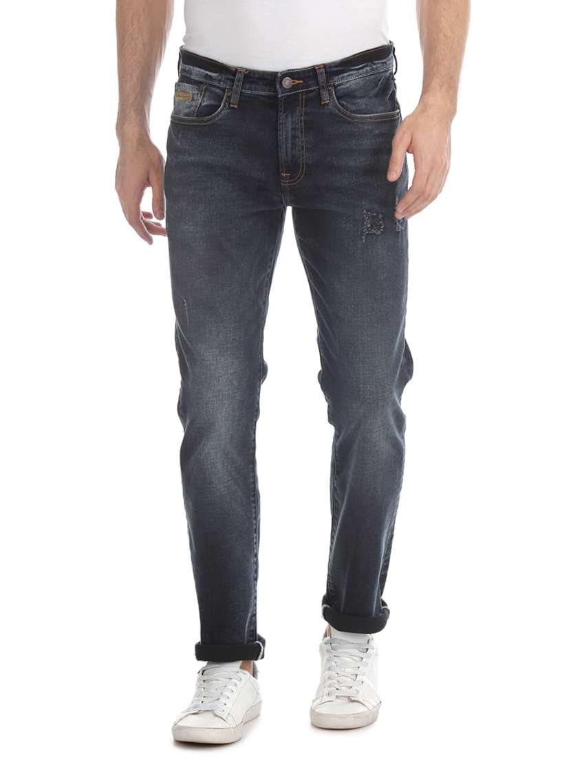 blue light washed distressed denim jean