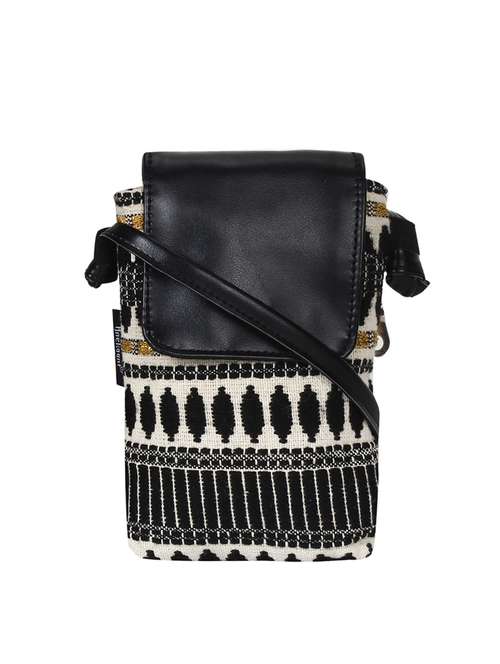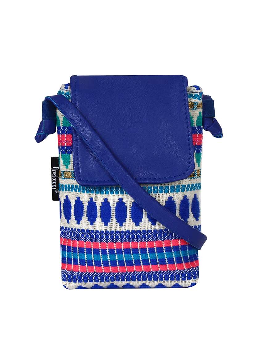 This blue and multicoloured striped jacquard mobile pouch has one main compartment with a flap. It also has one zip pocket at the Back.