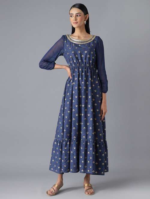 blue printed flared ethnic dress