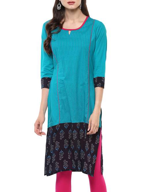 teal blue cotton printed straight kurta