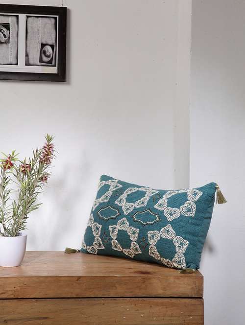 - » blanc9 royal damask peacock blue embroidered & embellished cotton rectangle cushion cover with tassels 12x20inches