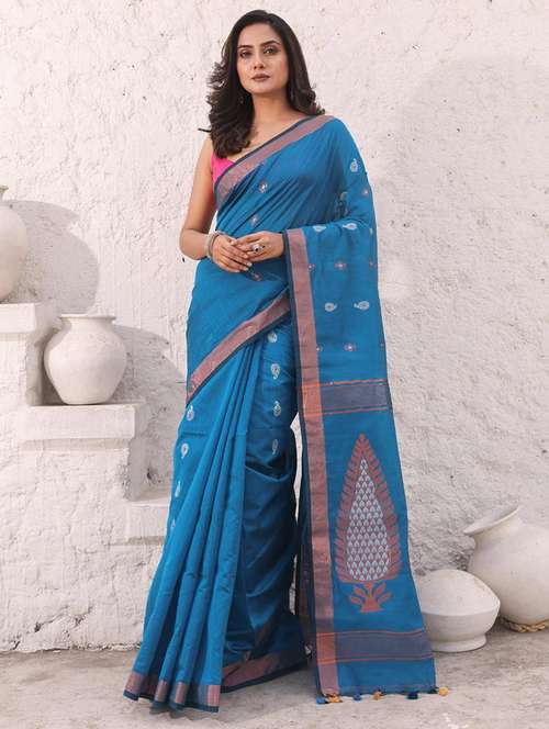 Look royal and loving in this sky blue cotton blend handloom saree. It has zari woven motifs all over along with zari border. The pallu has zari woven designs for a beautiful look.