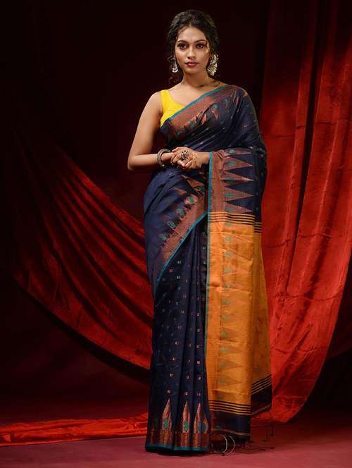 Style quotient and comfort is intertwined in this midnight blue blended cotton handwoven saree. It has small buttas woven all over. The borders have temple and paisley patterns. The yellow pallu compliments the look beautifully.