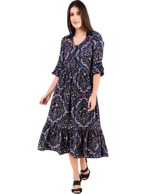 - » navy blue floral printed detailed fit & flare dress