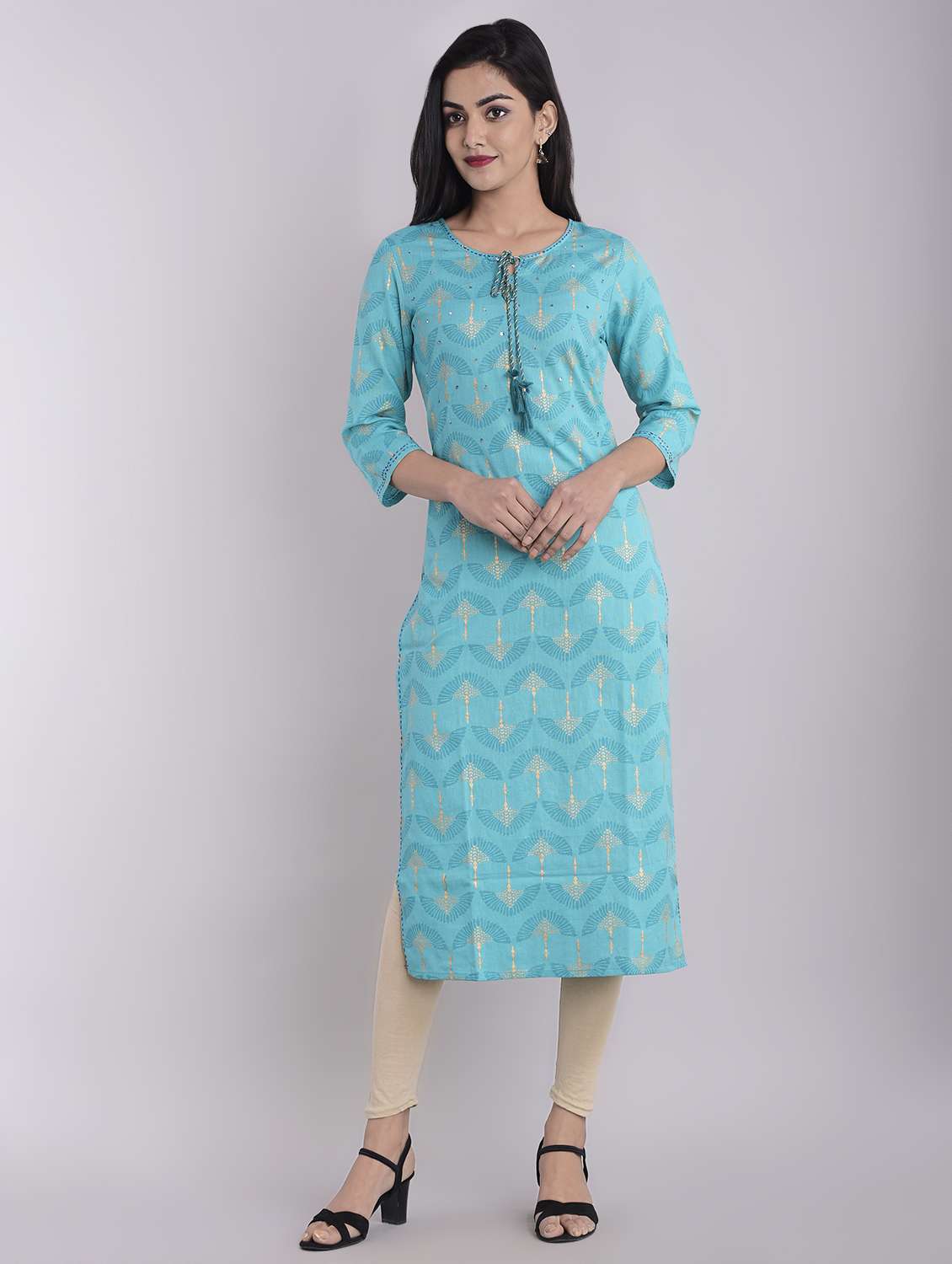 - Grab this beautiful kurta made up of cotton blend fabric featuring tie-up neck neck designs.