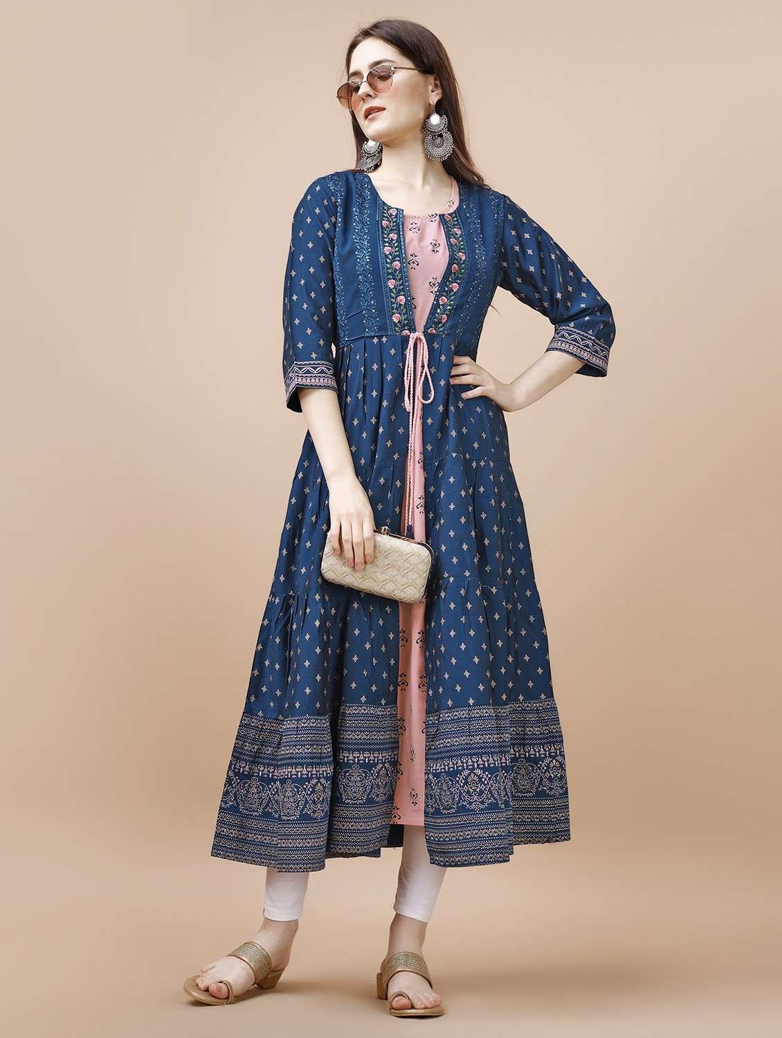 women blue round neck tiered kurta