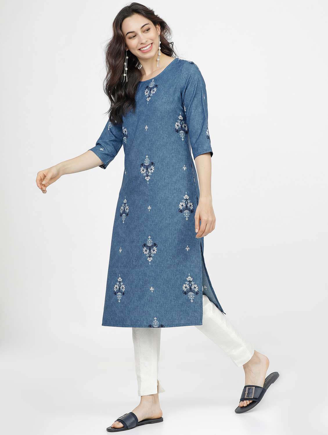 - Grab this beautiful kurta made up of cotton blend fabric featuring round neck designs.