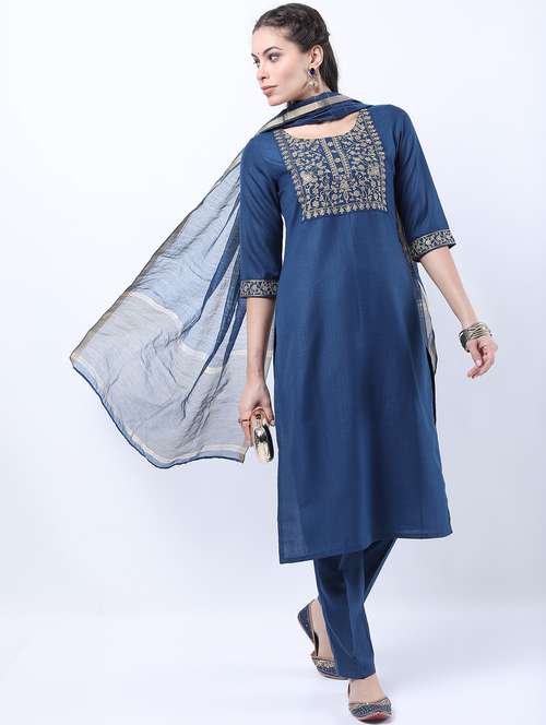 - Find gorgeous sets of ethnic wears in trending designs in blue colors suitable for casual wear of occasions.