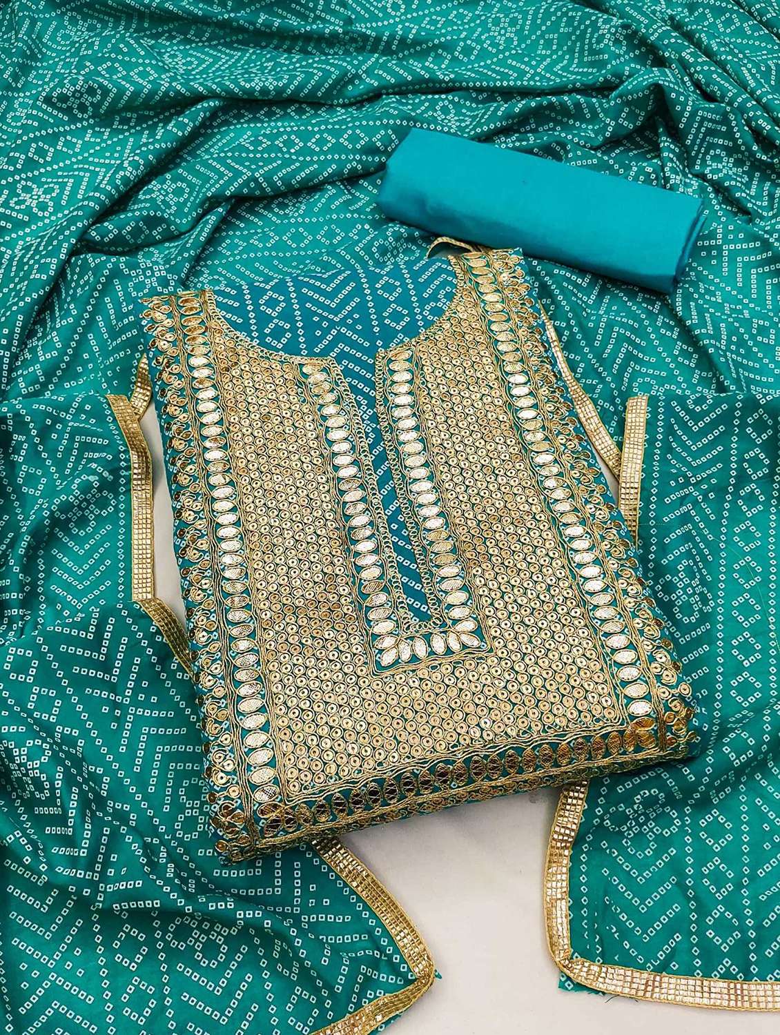 women bandhani printed embroidered unstitched suit set