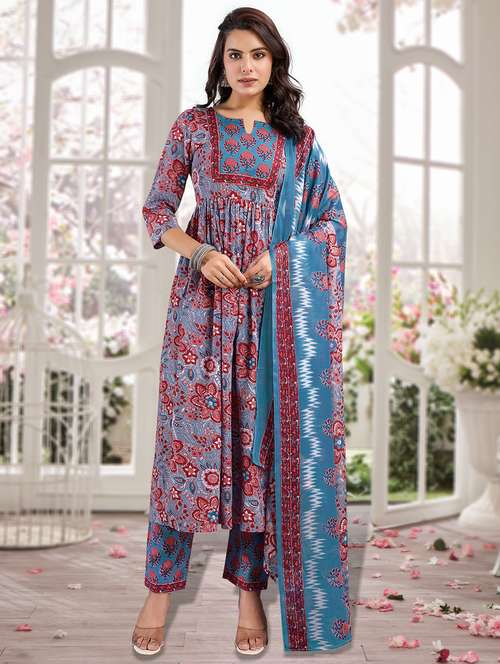 - Find gorgeous sets of ethnic wears in trending designs in blue colors suitable for casual wear of occasions.